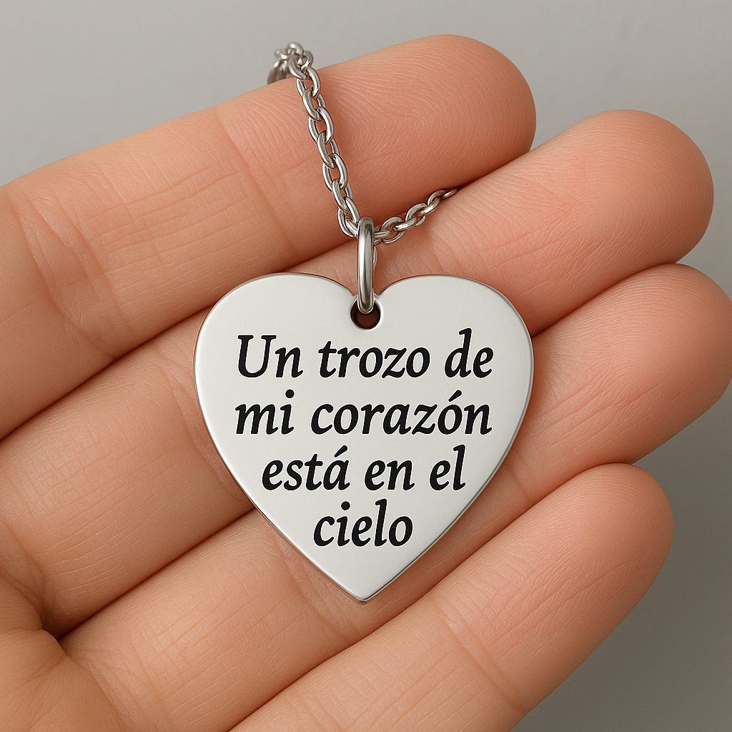 Hay amores que trascienden el tiempo y el espacio. Este delicado collar, con su dije en forma de corazón grabado con la frase "Un trozo de mi corazón está en el cielo", es mucho más que una joya: es un tributo lleno de amor y memoria para esa persona especial que ya no está físicamente, pero que sigue acompañándote en cada latido.